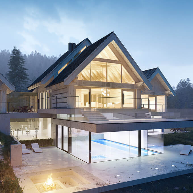 • Ốp đá granite màu xanh ngọc lục bảo cho các bức tường ngoài hướng ra đường phố ở các tầng đế.